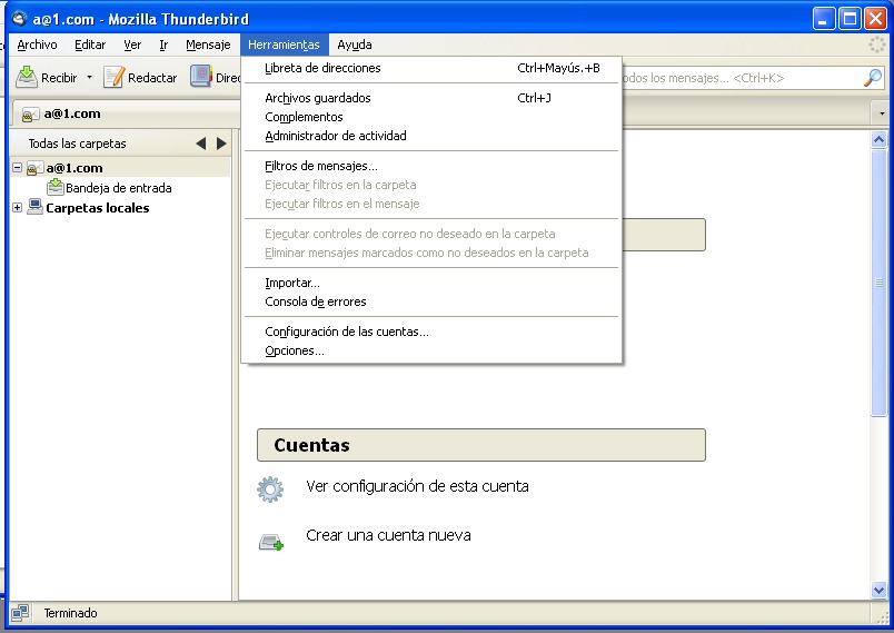 1.- Abrimos nuestro Thunderbird y entramos en Herramientas y dentro en la opción Configuración de las cuentas: