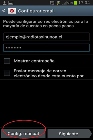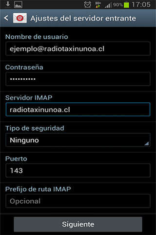 4- Introduzca la configuración del servidor entrante: Nombre de usuario, contraseña, servidor IMAP (Por ejemplo: radiotaxinunoa.cl), Puerto “por defecto es 143“, tipo de seguridad, y el correo electrónico.