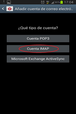 3- Seleccione el tipo de cuenta: POP3, IMAP, Microsoft® Exchange ActiveSync, según el caso.