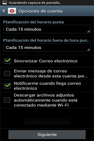 6- Ahora puede seleccionar opciones de cuenta: Crear una Planificación de correo electrónico (15 minutos por defecto), y envíar los mensajes de su cuenta por defecto (Casilla de verificación), etc.