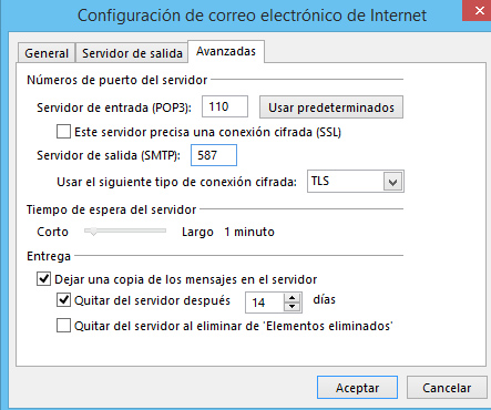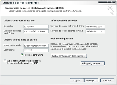 Paso 4. En la configuración del correo POP3 tiene que rellenar los campos de la siguiente forma: