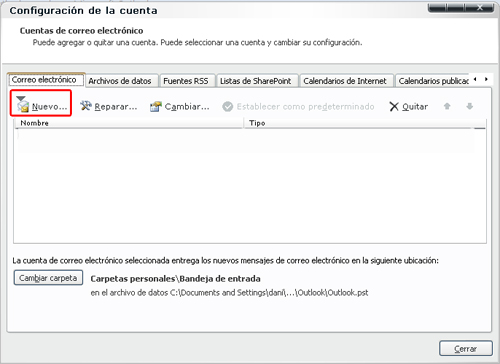 Paso 2. En la ventana que le aparece escoga Nuevo… para añadir la cuenta de correo.