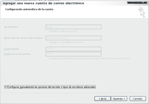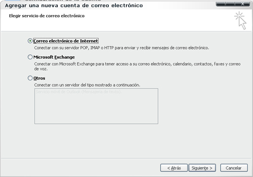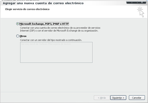 Paso 3. Seleccione Microsoft Exchange, POP3, IMAP o HTTP y pinche en Siguiente