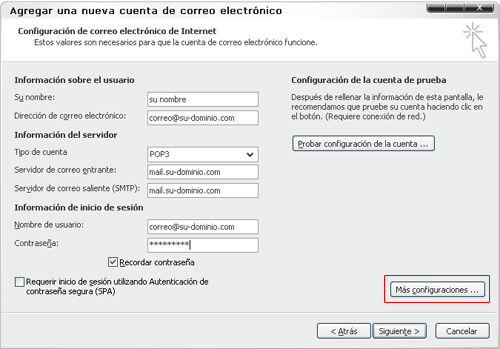 Una vez relleno todos los campos seleccione Más configuraciones…, aparece en la imagen en el cuadro rojo: