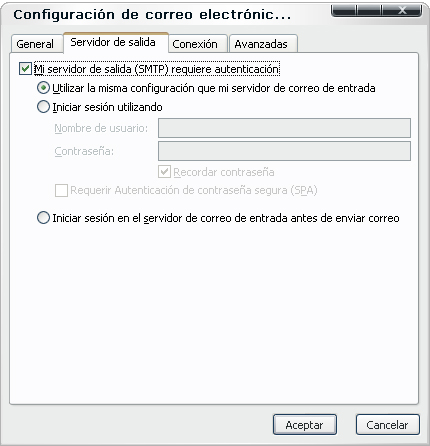 Paso 6. Una vez seleccionado Más configuraciones aparece una ventana donde tiene que escoger la pestaña Servidor de Salida, ahí seleccione Mi servidor de salida (SMTP) requiere autenticación.